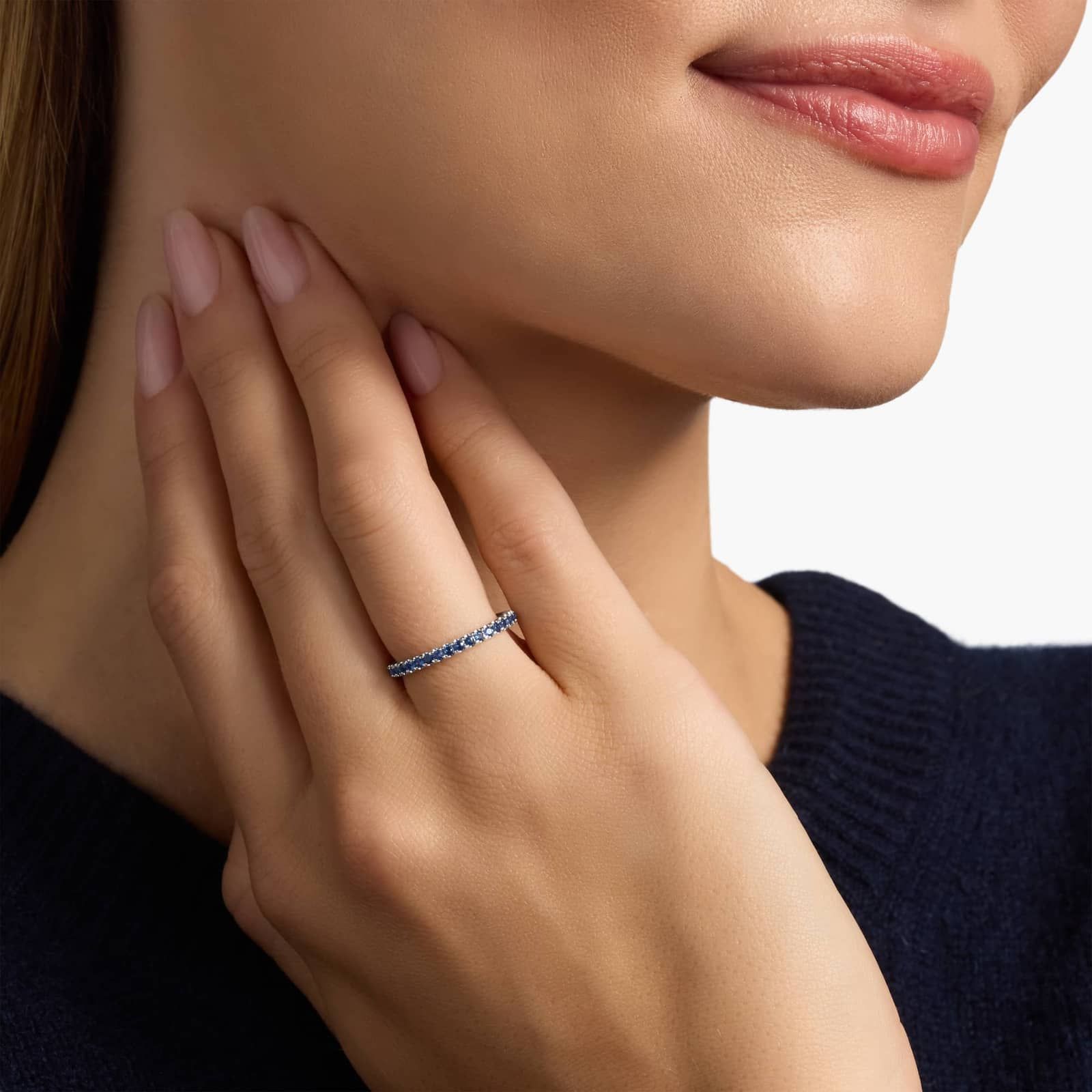 This sterling silver blue sapphire eternity band ring is designed to express timeless elegance through a continuous circle of deep blue brilliance set within a refined and delicate silhouette. The slim eternity profile wraps gracefully around the finger, creating a look that feels classic, luxurious, and effortlessly sophisticated.