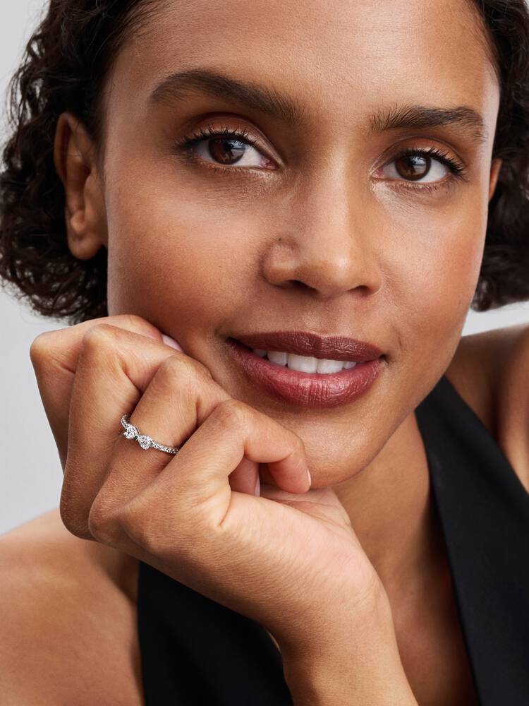 Each clear stone sparkles with a radiant brilliance, adding a sense of purity and sophistication to the design. The bow shaped setting symbolizes elegance and charm, while the slim band is adorned with subtle accent stones that enhance the overall shimmer without overpowering the centerpiece.