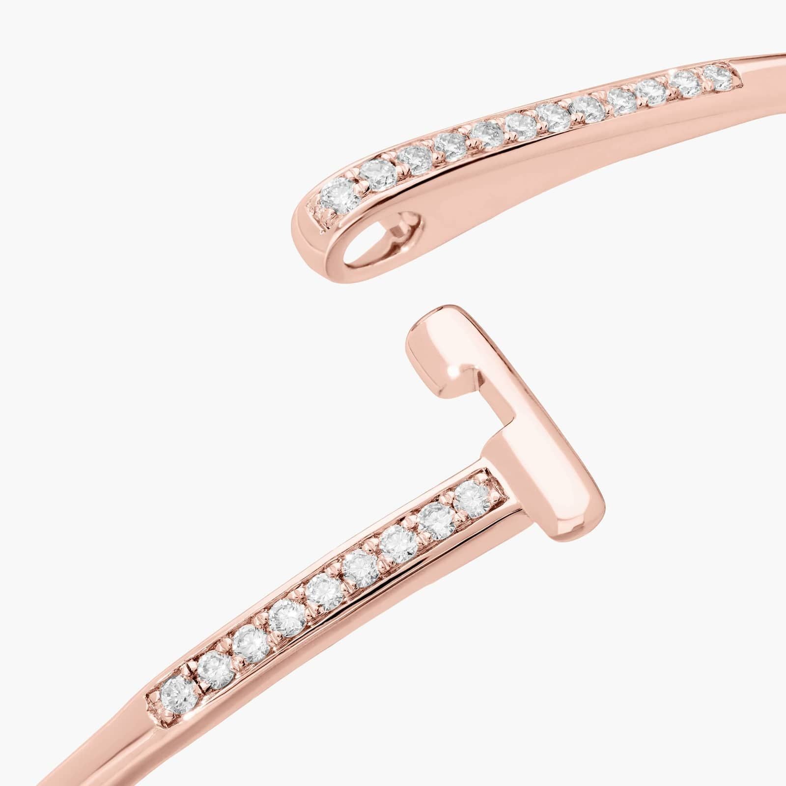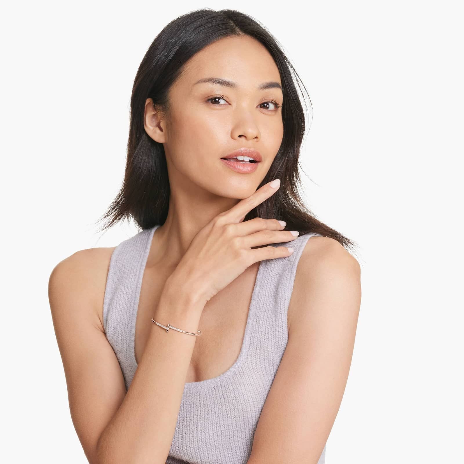 This refined rose gold bracelet features a modern crossover design accented with a delicate line of sparkling stones that bring a subtle yet captivating radiance. Its slender silhouette creates a sophisticated and airy look, allowing the bracelet to rest gracefully on the wrist while maintaining a luxurious presence. The smooth curves and balanced proportions make it a perfect choice for both everyday wear and elevated styling.