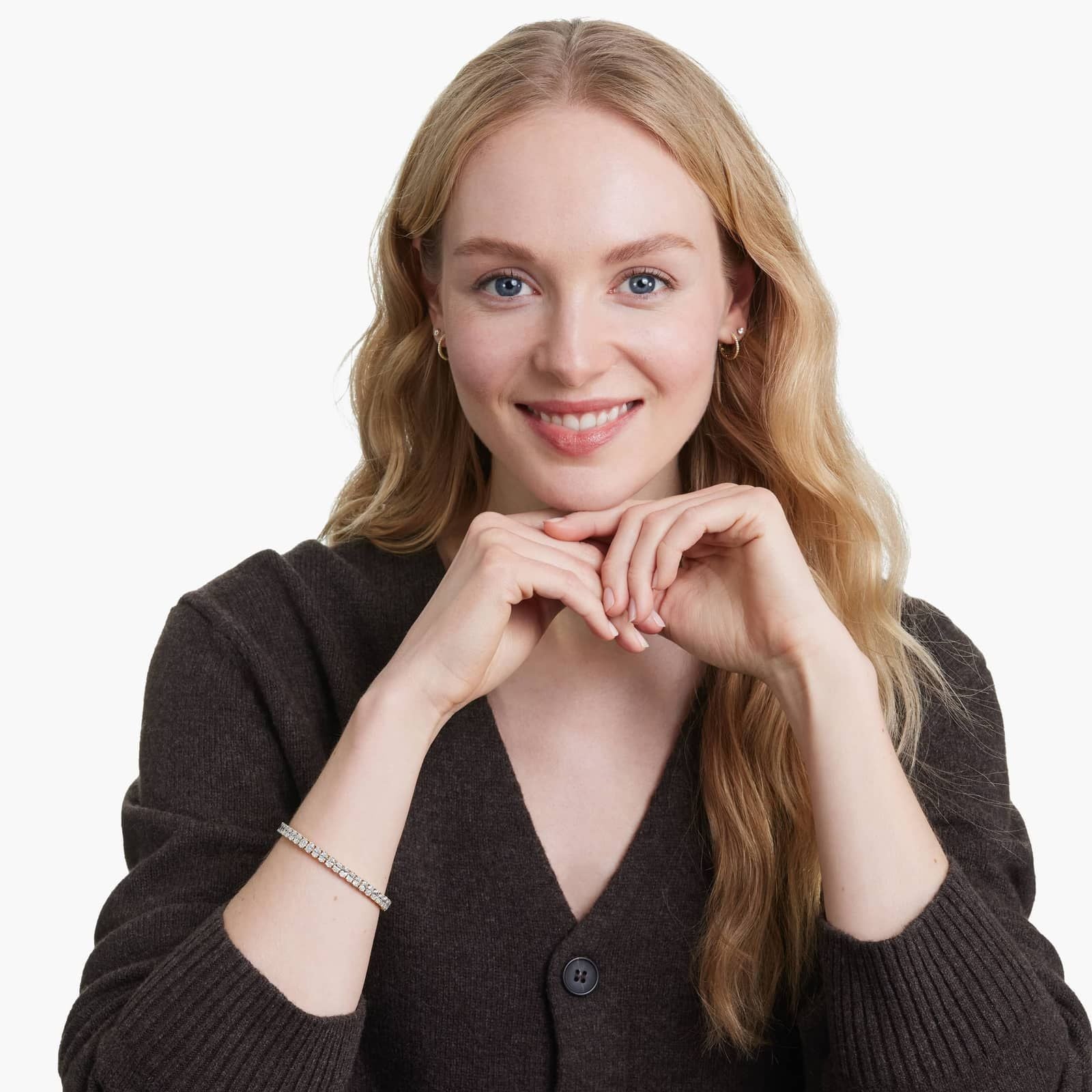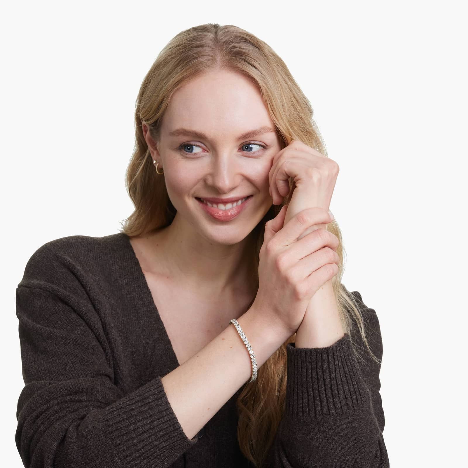 The smooth elegant design rests comfortably along the wrist with a gentle fluidity that adds sophistication to both everyday style and elevated moments. Its luxurious sparkle and serene silver finish create a harmonious balance of grace and confidence making it a piece that feels enduring and emotionally captivating.