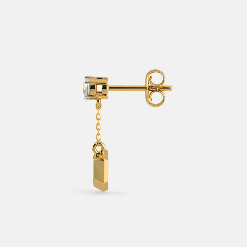 This silver diamond drop stud earring design blends modern geometry with delicate movement, creating a refined statement that feels both contemporary and elegant. Crafted in polished silver, the round diamond stud sits gracefully at the ear, leading into a fine silver link that suspends a faceted geometric drop. The clean angles of the dangling element contrast beautifully with the soft brilliance of the diamond, allowing light to reflect from every surface with subtle sophistication.