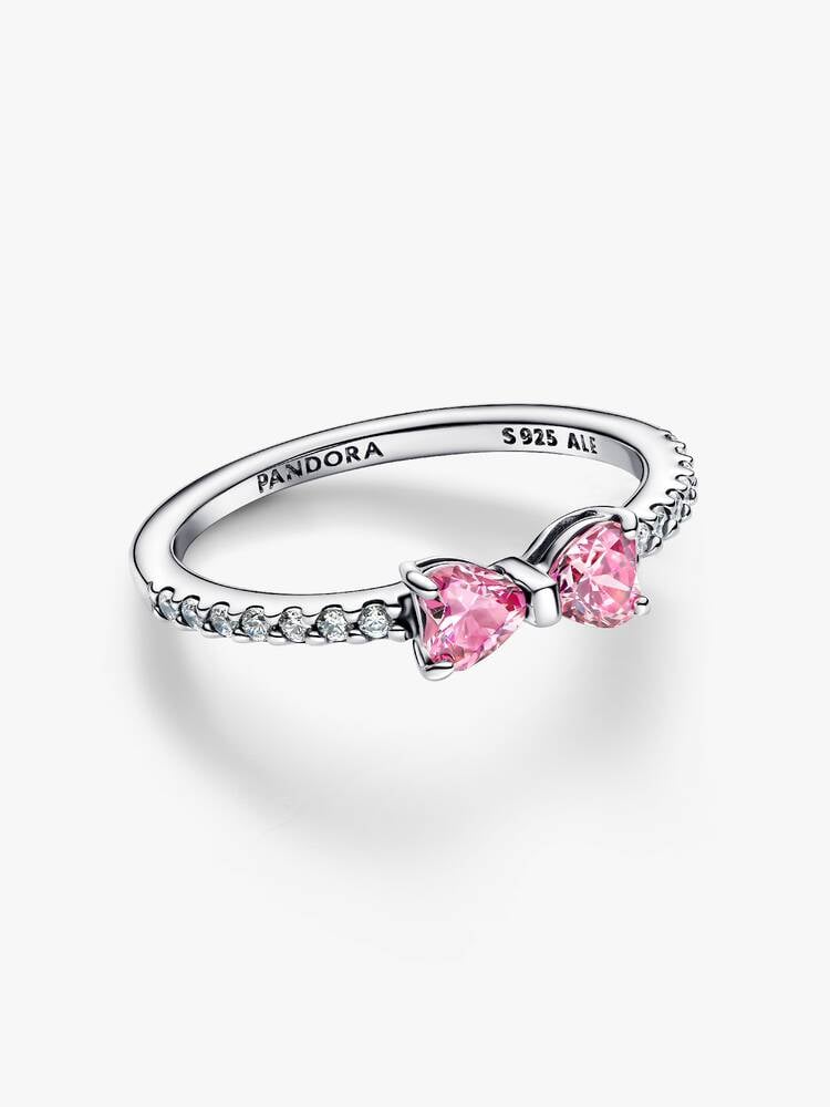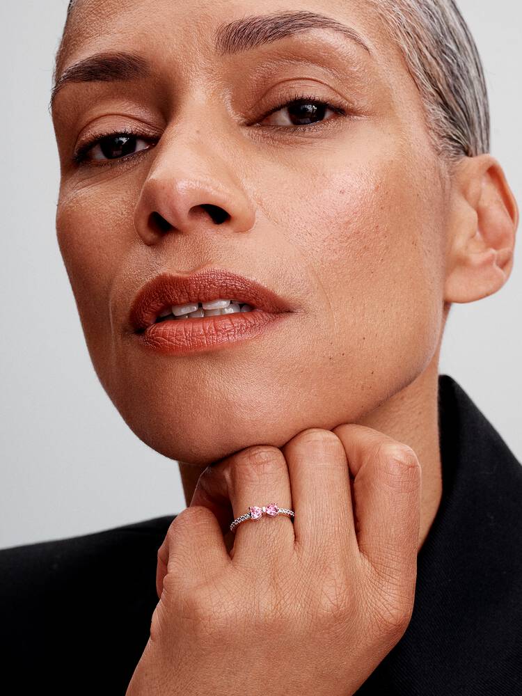 Each heart shaped pink stone reflects gentle light with a soft blush tone, creating a feminine and graceful focal point. The smooth contours of the heart stones are complemented by a subtle line of shimmering accent stones set along the band, adding refined brilliance without overpowering the design.