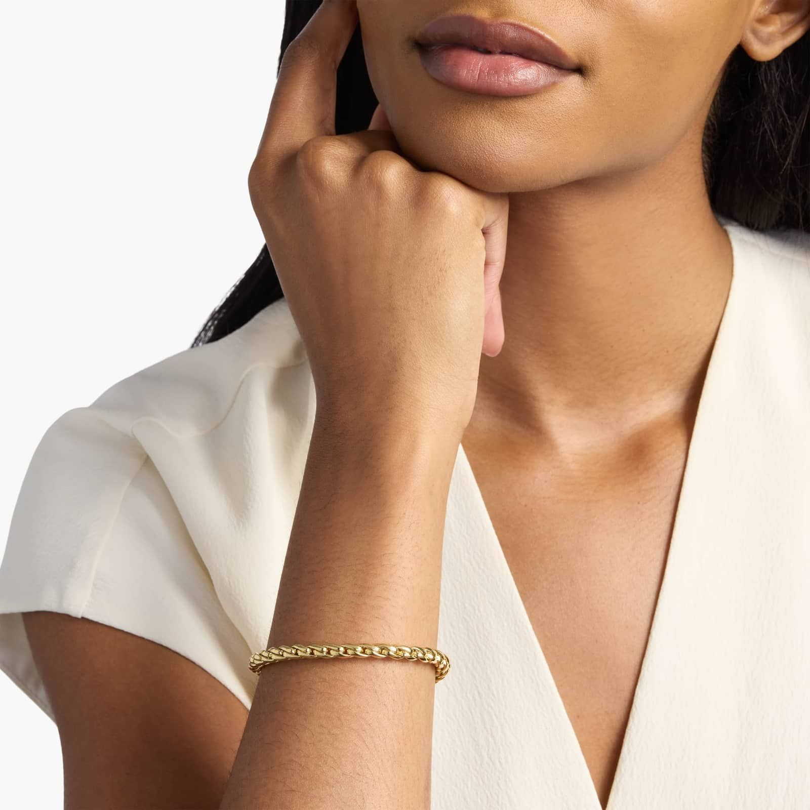 Finished with a high polish yellow gold surface, the bracelet reflects light beautifully across its curved links, delivering a warm and lasting shine. The rounded edges ensure a comfortable feel, making it suitable for long hours of wear without irritation.