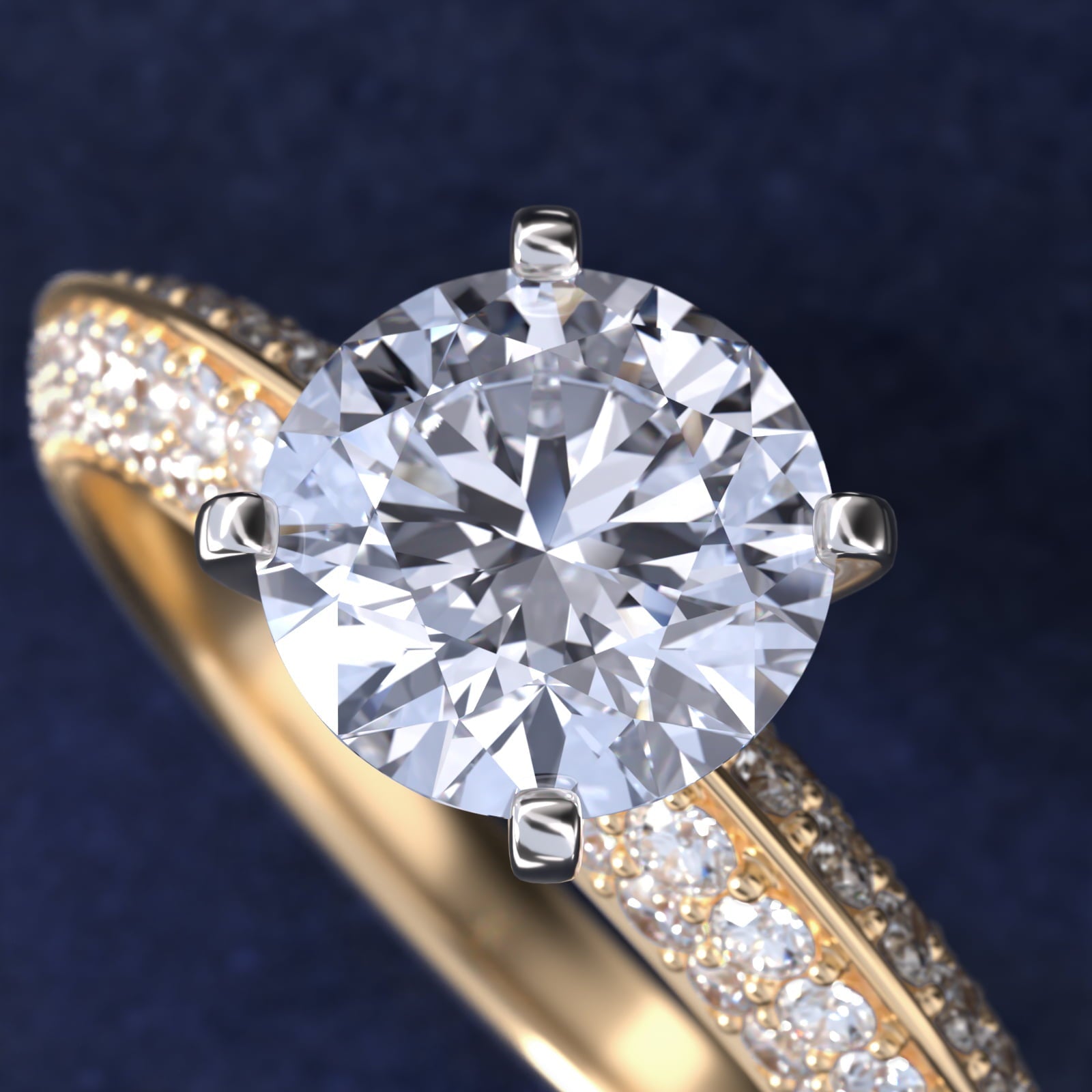 This round cut diamond ring highlights the most classic and brilliant diamond shape, known for its unmatched sparkle and symmetry. The round brilliant center diamond is secured in a four-prong setting that allows maximum light return from every angle. Crafted in polished yellow gold, the band is adorned with pavé-set round diamonds that enhance the center stone without overpowering it. Timeless, elegant, and versatile, this ring is a perfect choice for engagements or refined everyday luxury.