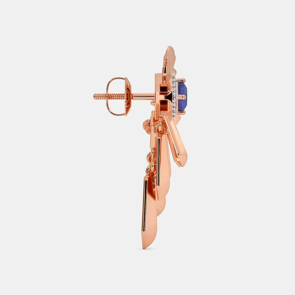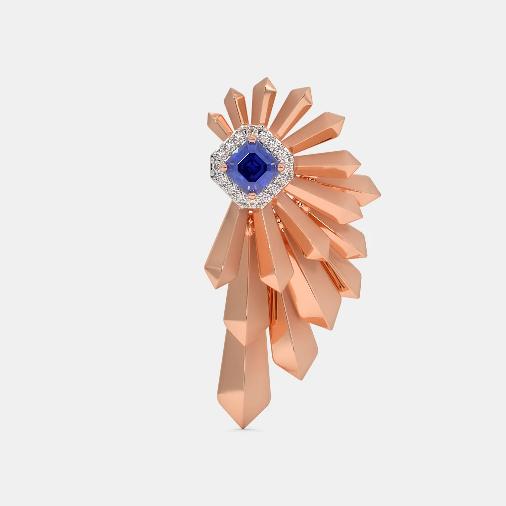 This silver geometric fan diamond stud earring is designed to make a bold artistic statement through its striking sculptural form and refined detailing. The layered fan inspired structure radiates outward in polished silver, creating a dramatic play of angles and depth that catches light from multiple directions. At the center, a deep toned stone framed by shimmering diamonds adds contrast and brilliance, elevating the overall design while maintaining an elegant balance between structure and sparkle.