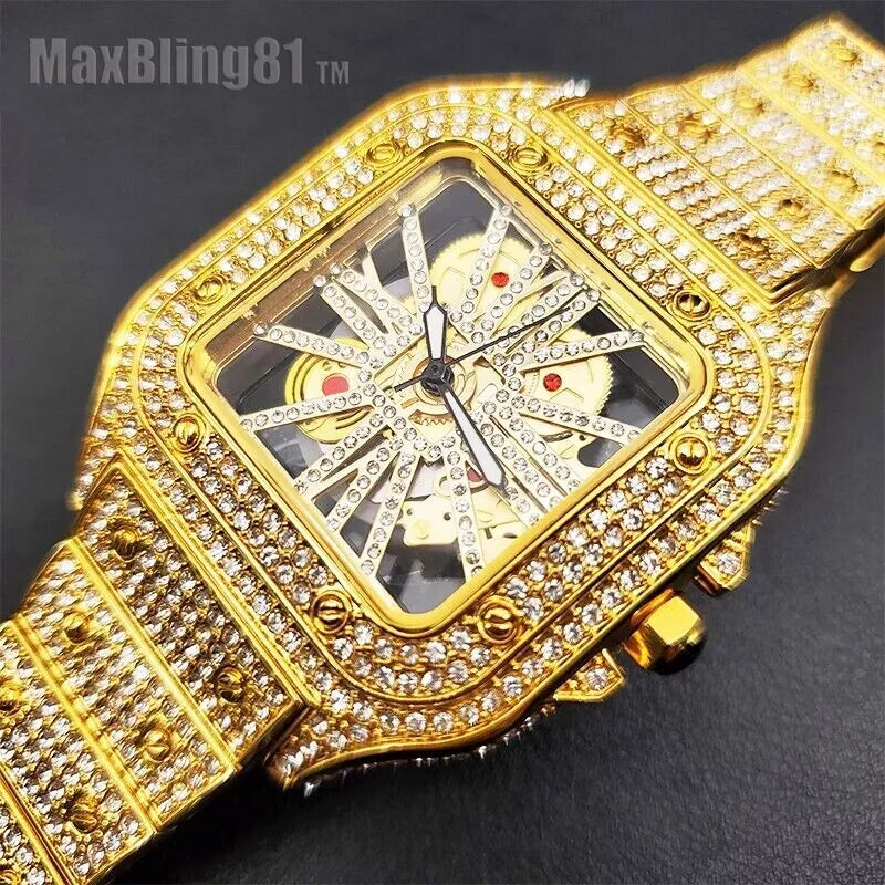A striking showcase of intricate design and radiant brilliance, this classic square skeleton dial watch is crafted to captivate with its fully diamond set aesthetic and exposed inner detailing. The open dial reveals a beautifully structured layout adorned with diamond accented elements that create depth, dimension, and continuous sparkle. Framed by a bold square silhouette, the design delivers a powerful visual impact while maintaining refined elegance and precision.